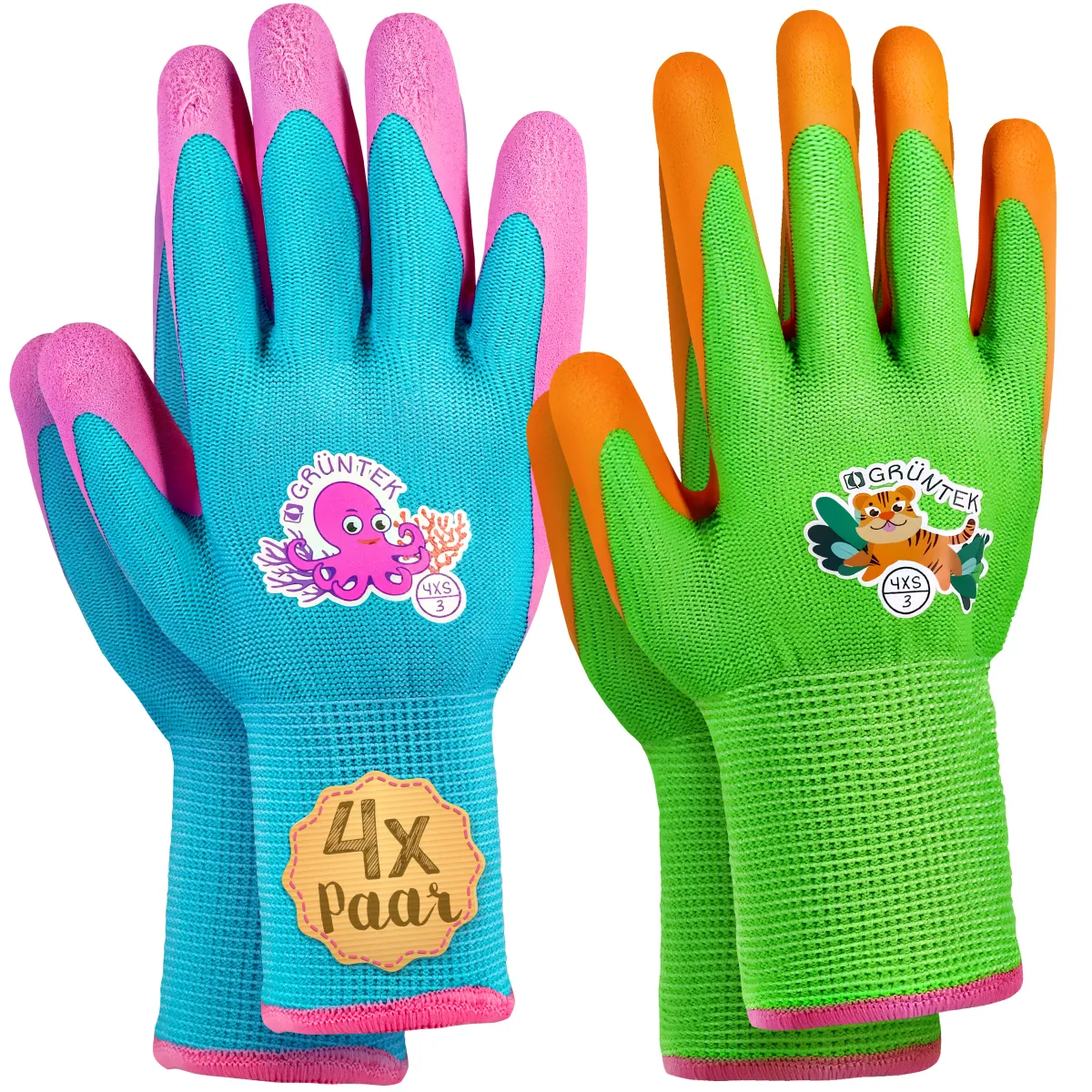 GRÜNTEK Kinder-Gartenhandschuhe 4 Paar, Schutzhandschuhe Kids, rutschfeste Latexbeschichtung, BPA-frei, schadstofffrei, geprüft und zertifiziert nach EN 420 & EN 388