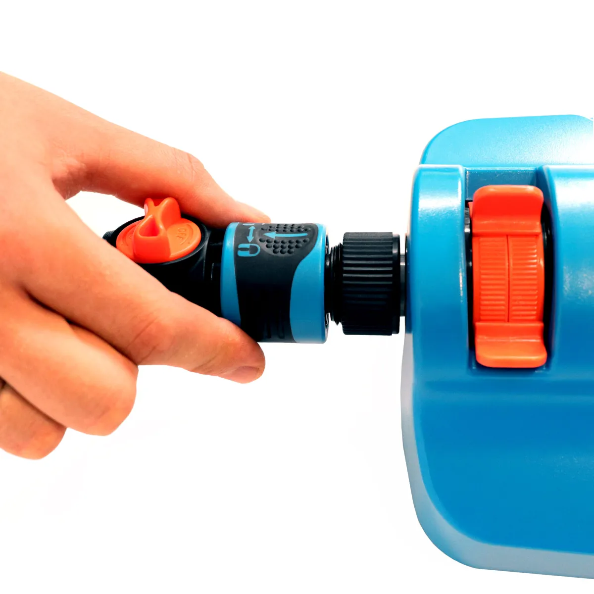 Die ergonomische Soft-Ummantelung von Schlauchverbinder und Konnektor ermöglicht selbst bei nassen Händen einen festen Halt. Dank des Wasser-Stop-Systems des Konnektors kann zwischen unterschiedlichen Bewässerungssystemen gewechselt werden, ohne dafür das Wasser abstellen zu müssen.